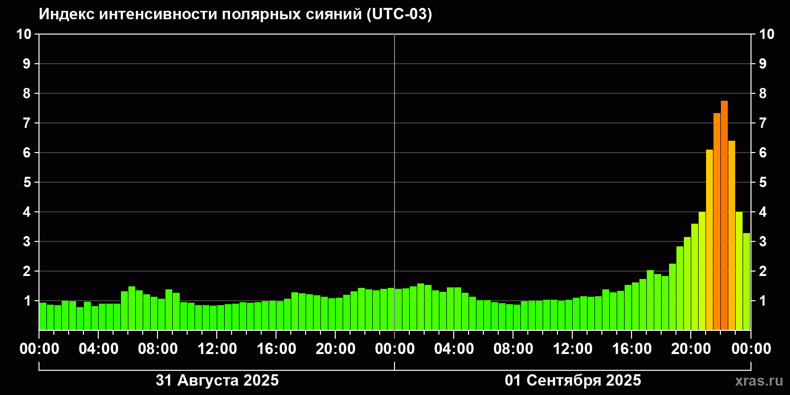 Изменения индекса интенсивности полярных сияний с 2025-08-31 по 2025-09-01 по местному времени