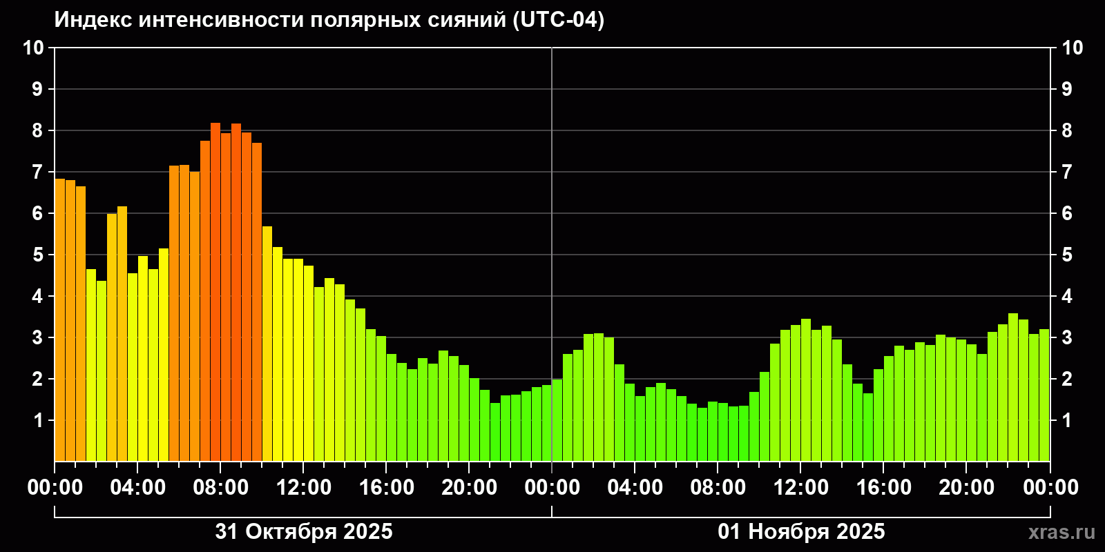 Изменения индекса интенсивности полярных сияний с 2025-10-31 по 2025-11-01 по местному времени