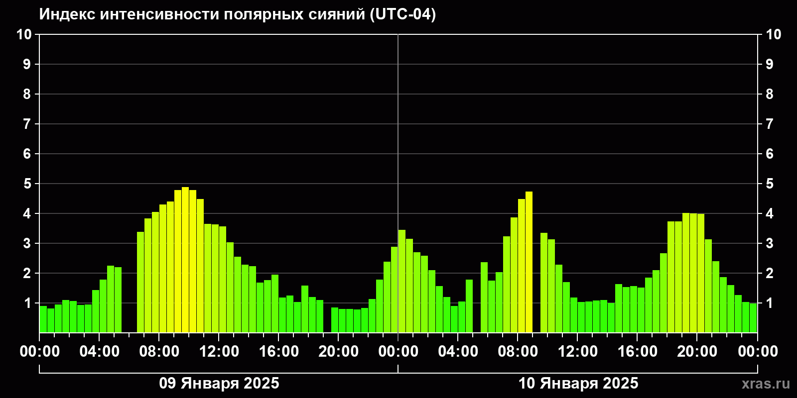Изменения индекса интенсивности полярных сияний с 2025-01-09 по 2025-01-10 по местному времени