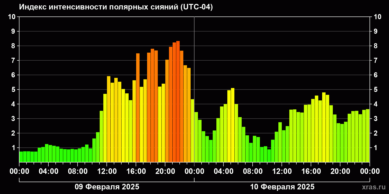 Изменения индекса интенсивности полярных сияний с 2025-02-09 по 2025-02-10 по местному времени