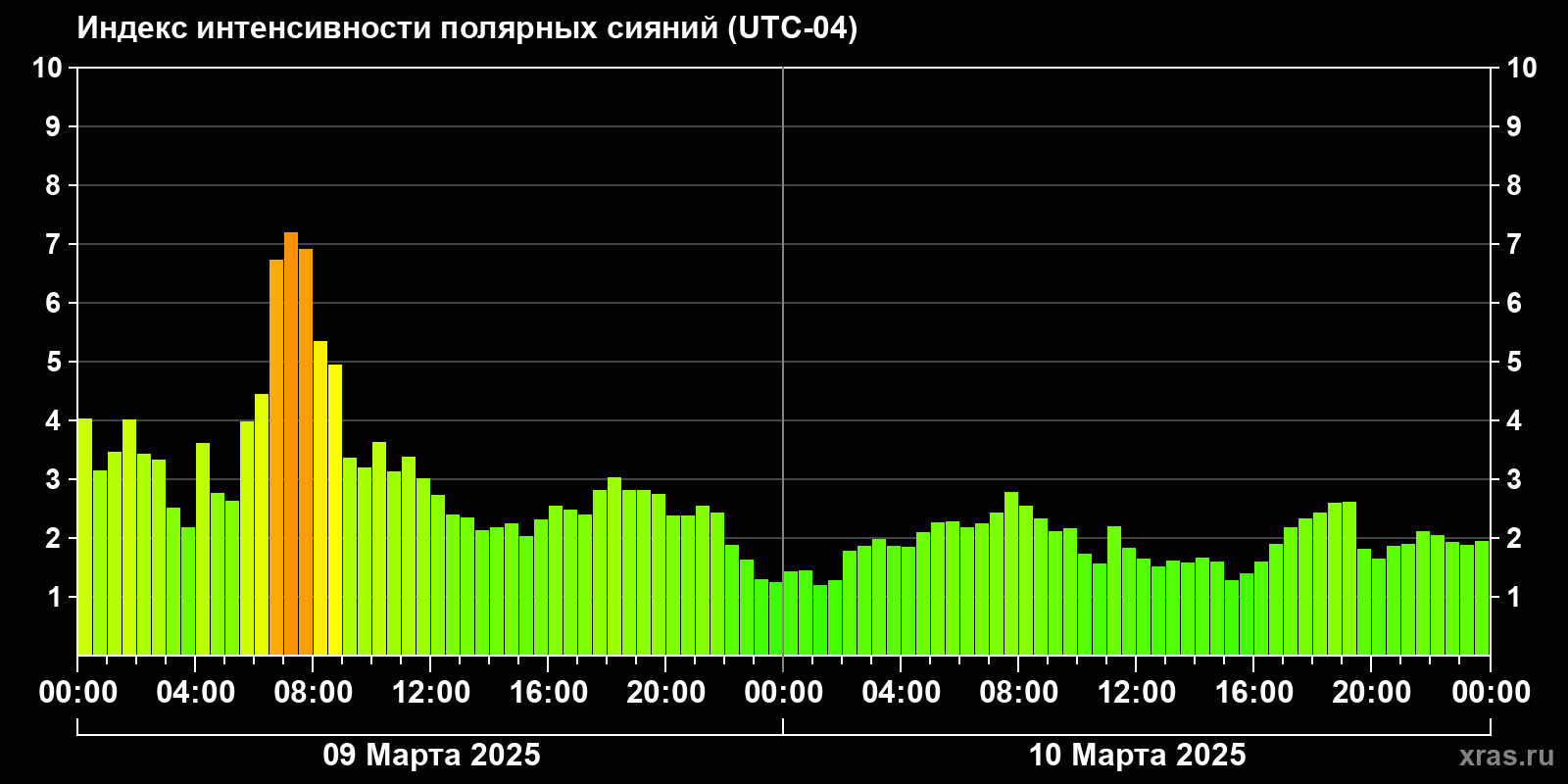 Изменения индекса интенсивности полярных сияний с 2025-03-09 по 2025-03-10 по местному времени