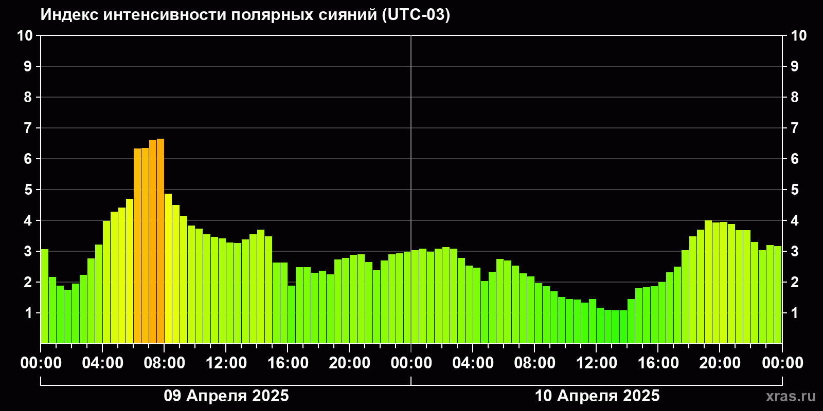 Изменения индекса интенсивности полярных сияний с 2025-04-09 по 2025-04-10 по местному времени