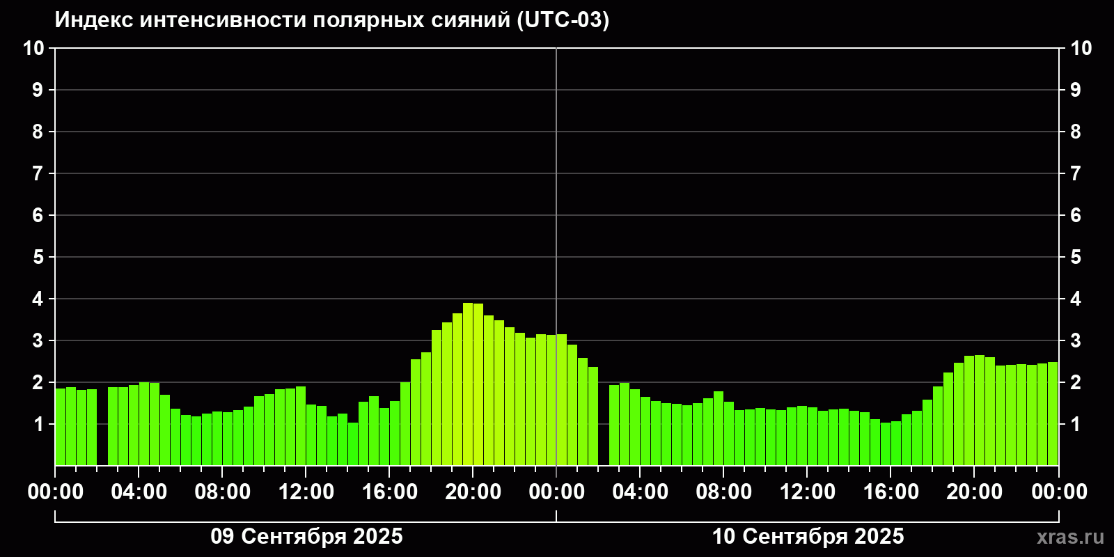 Изменения индекса интенсивности полярных сияний с 2025-09-09 по 2025-09-10 по местному времени