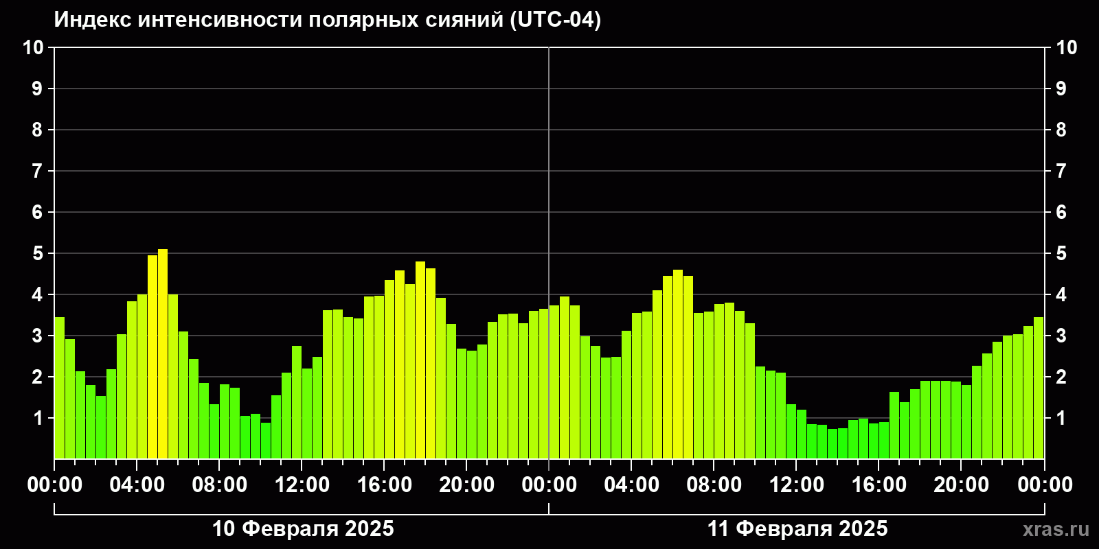 Изменения индекса интенсивности полярных сияний с 2025-02-10 по 2025-02-11 по местному времени