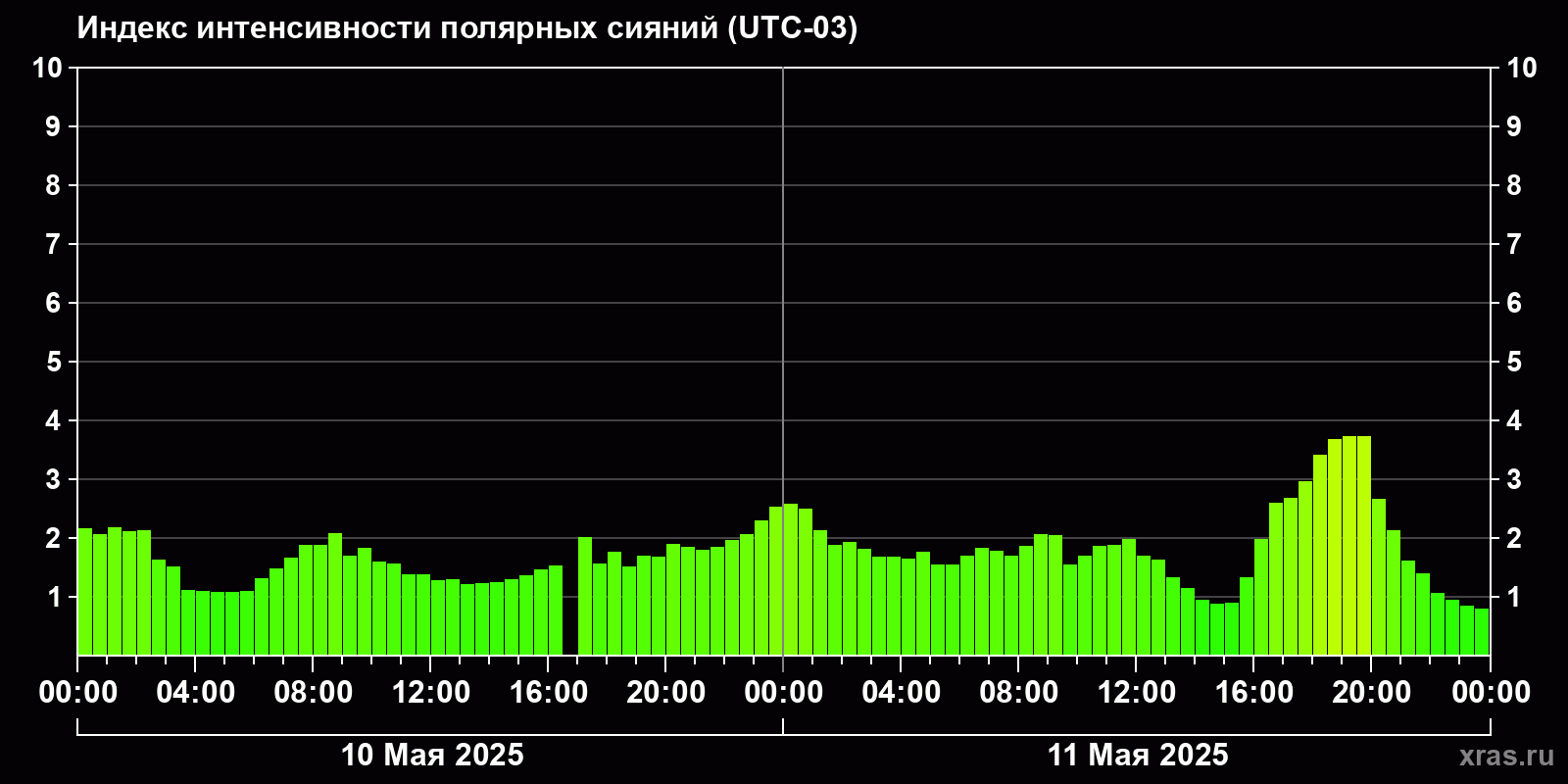Изменения индекса интенсивности полярных сияний с 2025-05-10 по 2025-05-11 по местному времени