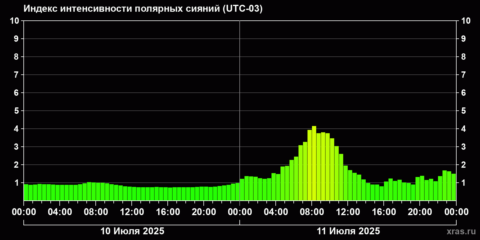 Изменения индекса интенсивности полярных сияний с 2025-07-10 по 2025-07-11 по местному времени