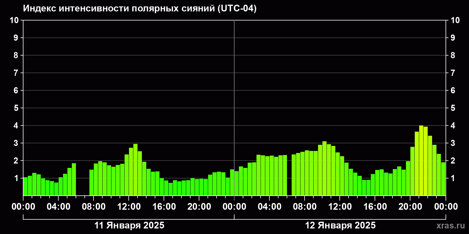 Изменения индекса интенсивности полярных сияний с 2025-01-11 по 2025-01-12 по местному времени