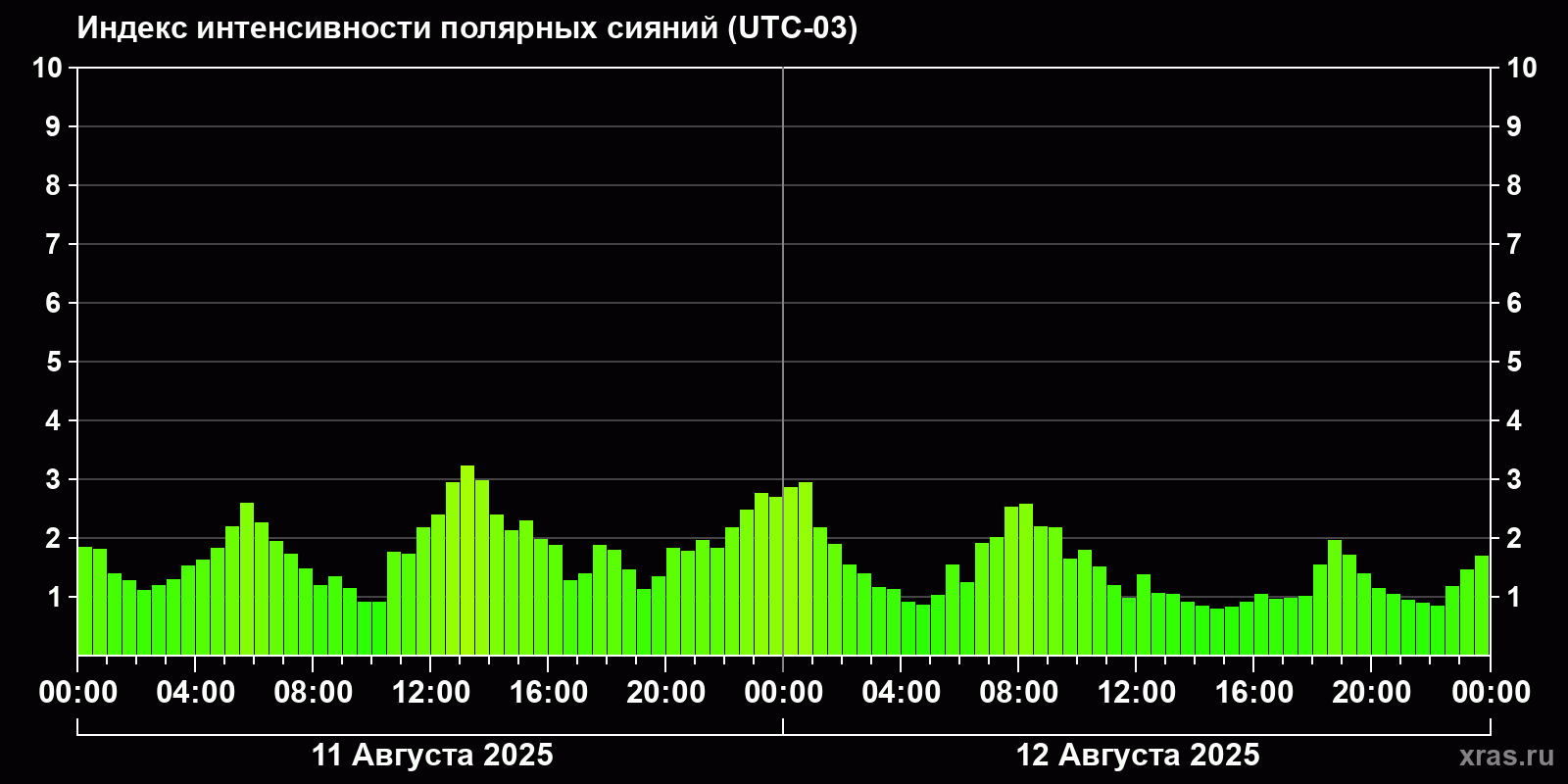 Изменения индекса интенсивности полярных сияний с 2025-08-11 по 2025-08-12 по местному времени