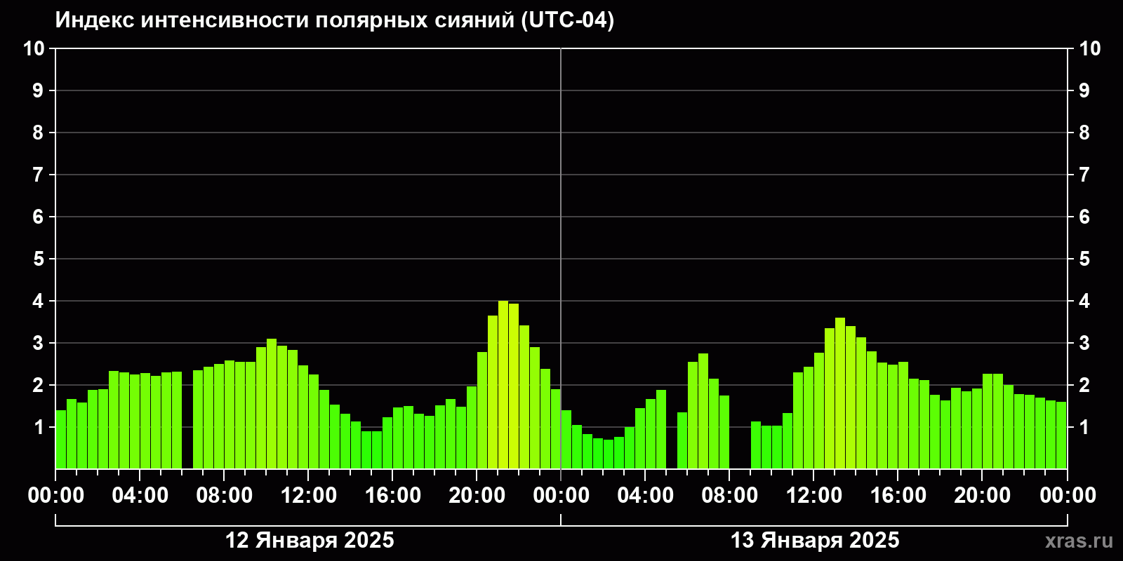 Изменения индекса интенсивности полярных сияний с 2025-01-12 по 2025-01-13 по местному времени
