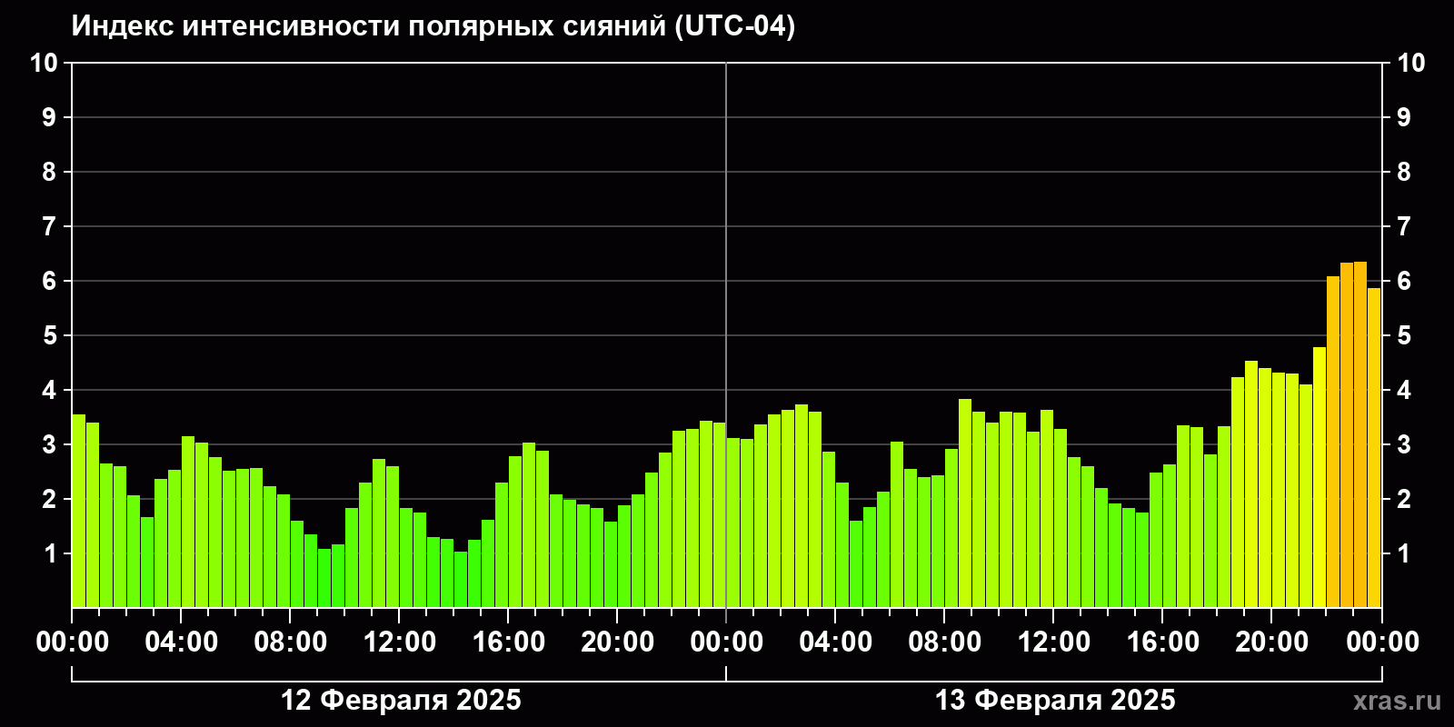Изменения индекса интенсивности полярных сияний с 2025-02-12 по 2025-02-13 по местному времени