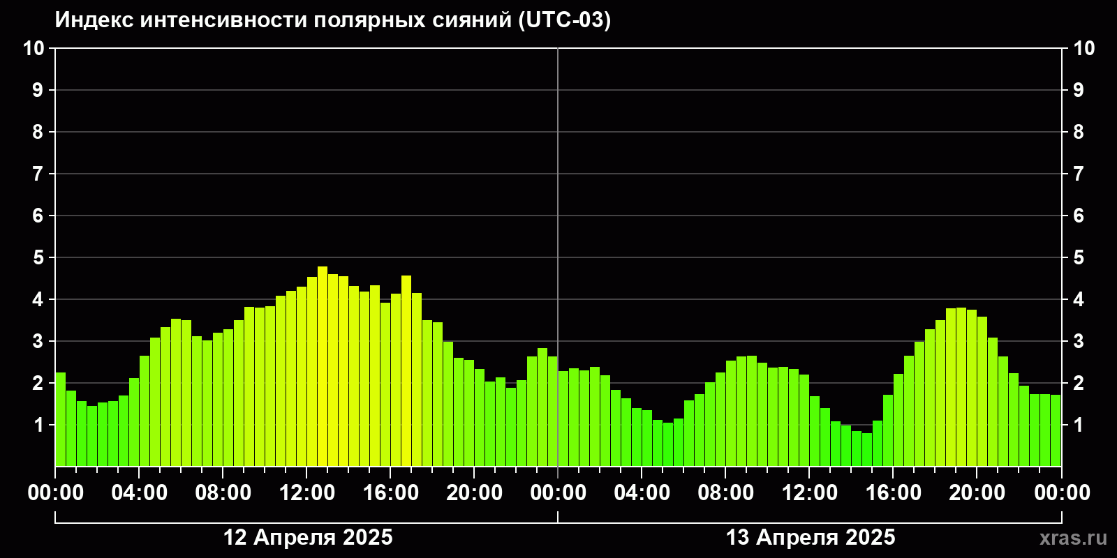 Изменения индекса интенсивности полярных сияний с 2025-04-12 по 2025-04-13 по местному времени