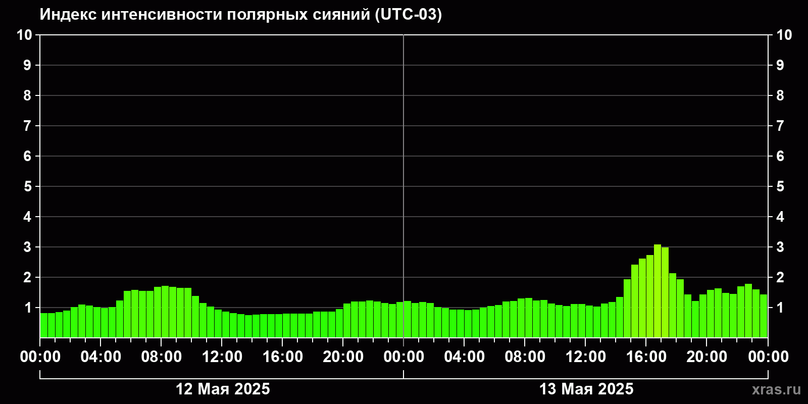 Изменения индекса интенсивности полярных сияний с 2025-05-12 по 2025-05-13 по местному времени