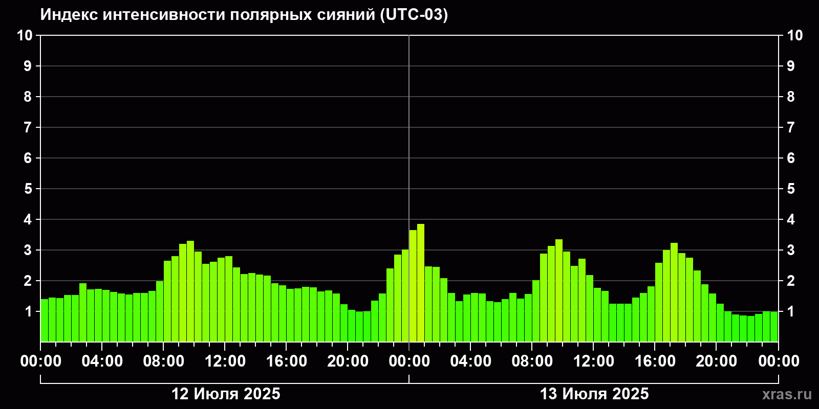 Изменения индекса интенсивности полярных сияний с 2025-07-12 по 2025-07-13 по местному времени