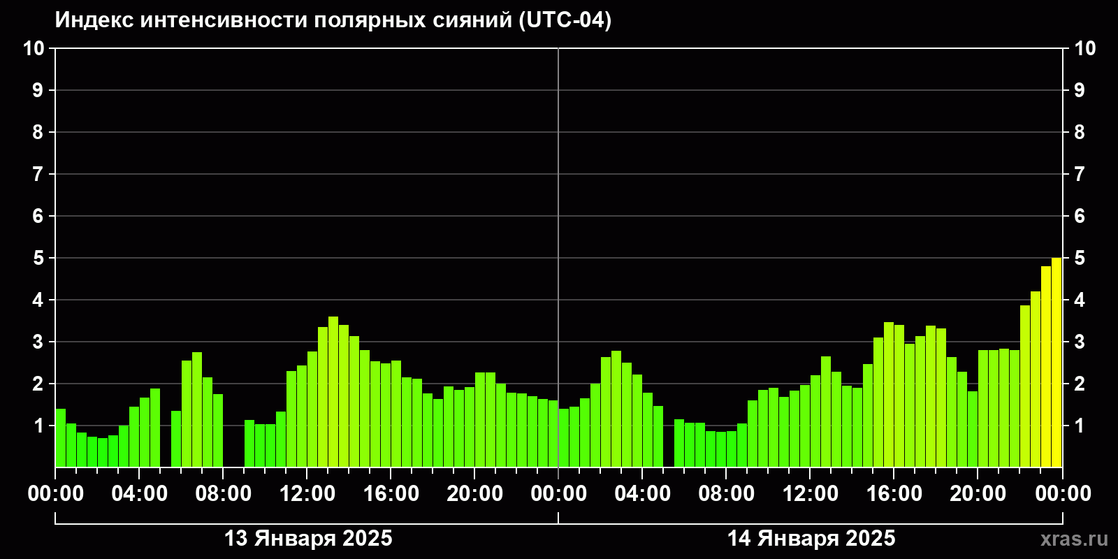 Изменения индекса интенсивности полярных сияний с 2025-01-13 по 2025-01-14 по местному времени