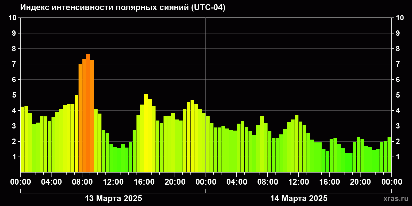 Изменения индекса интенсивности полярных сияний с 2025-03-13 по 2025-03-14 по местному времени