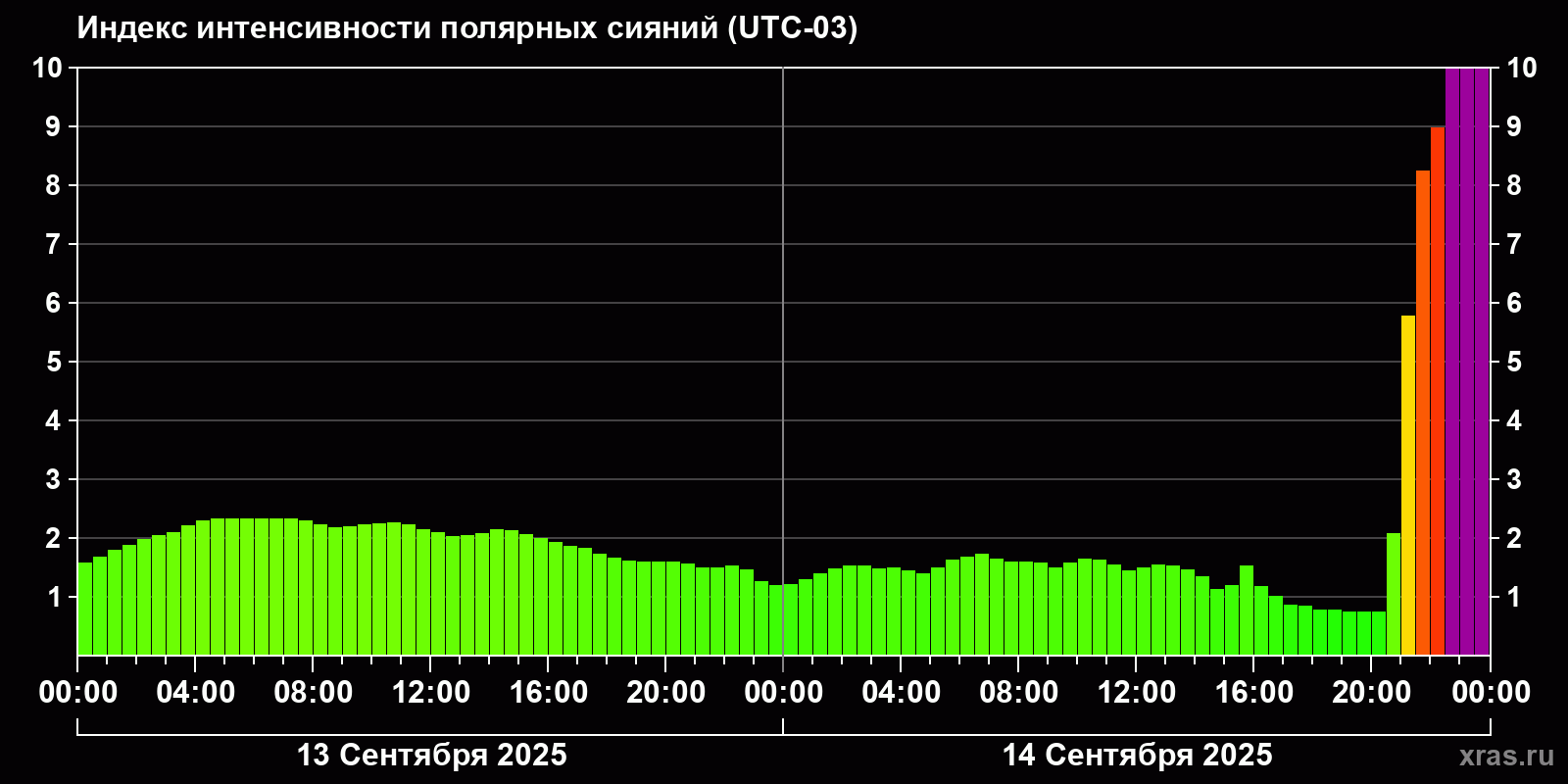 Изменения индекса интенсивности полярных сияний с 2025-09-13 по 2025-09-14 по местному времени