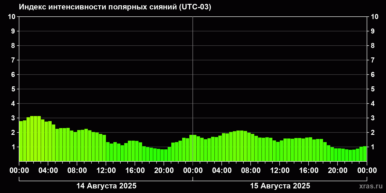 Изменения индекса интенсивности полярных сияний с 2025-08-14 по 2025-08-15 по местному времени