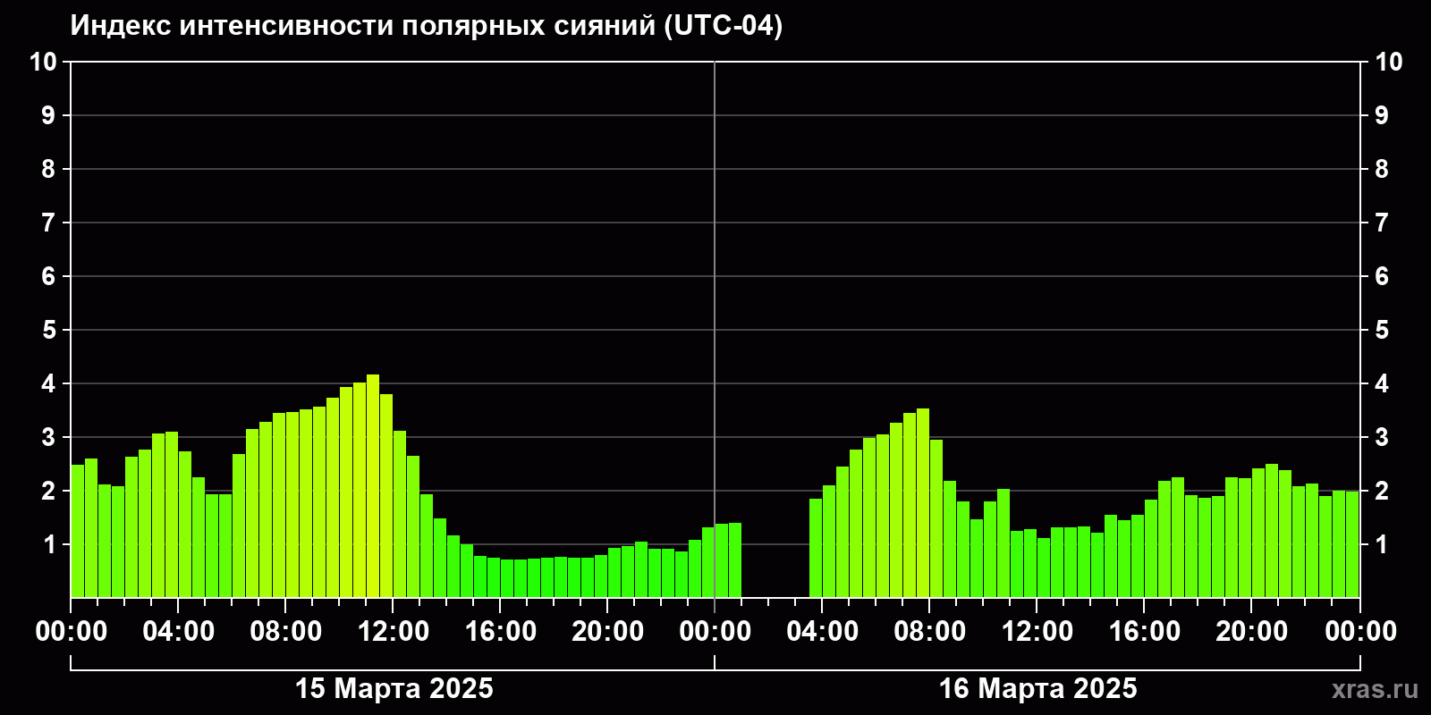 Изменения индекса интенсивности полярных сияний с 2025-03-15 по 2025-03-16 по местному времени