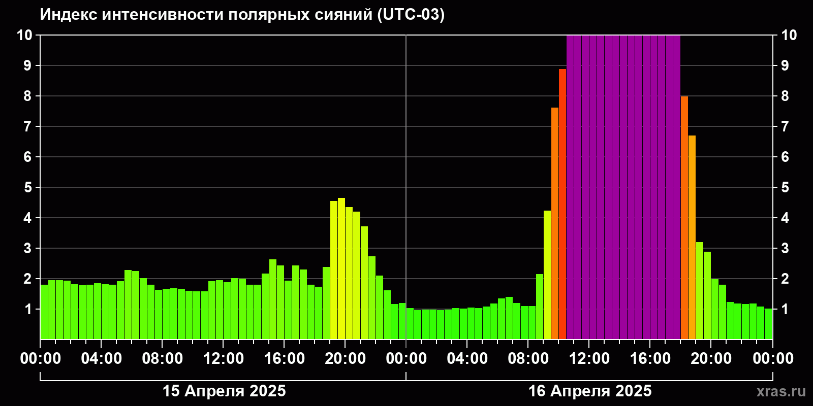 Изменения индекса интенсивности полярных сияний с 2025-04-15 по 2025-04-16 по местному времени