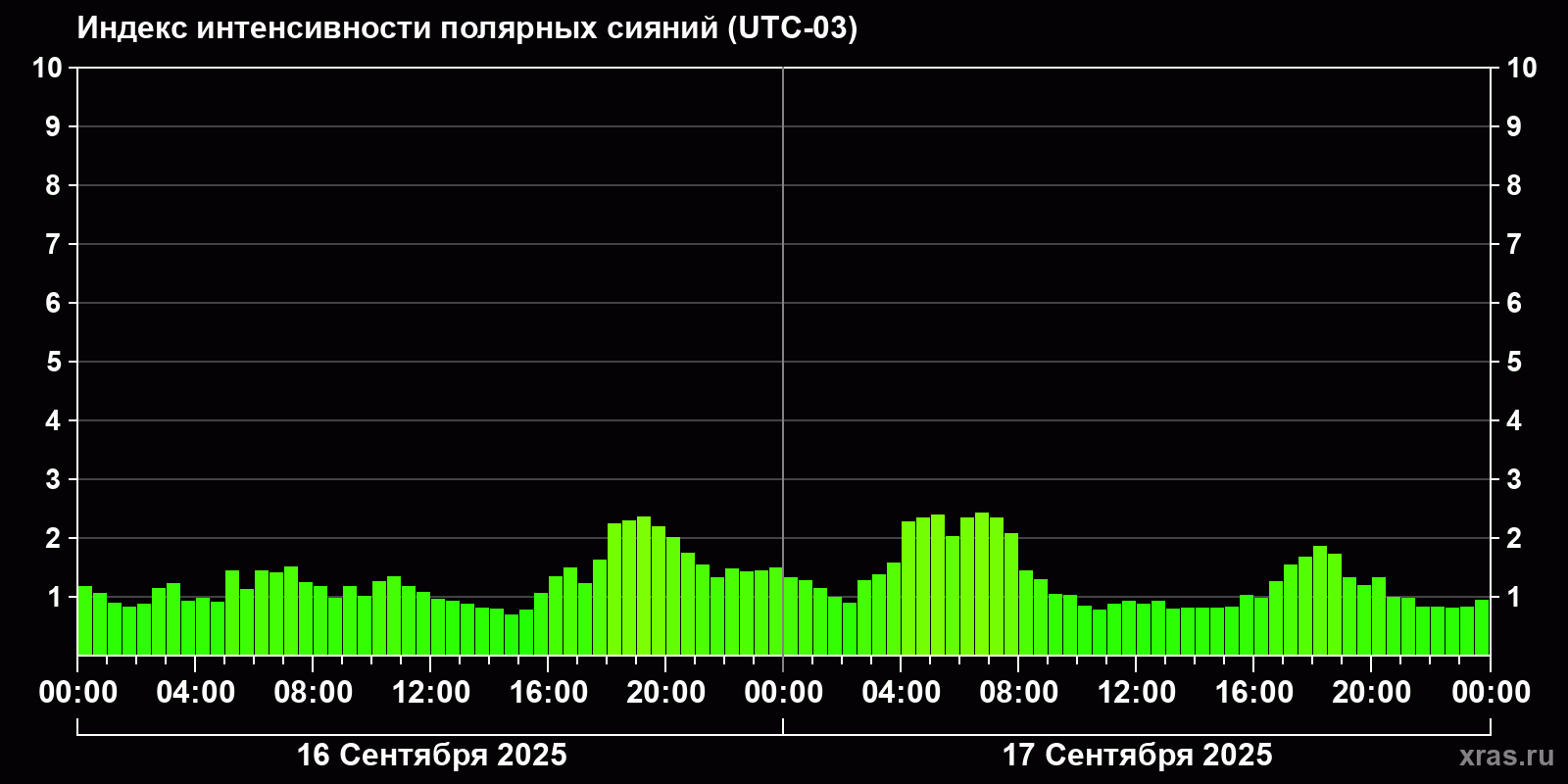 Изменения индекса интенсивности полярных сияний с 2025-09-16 по 2025-09-17 по местному времени