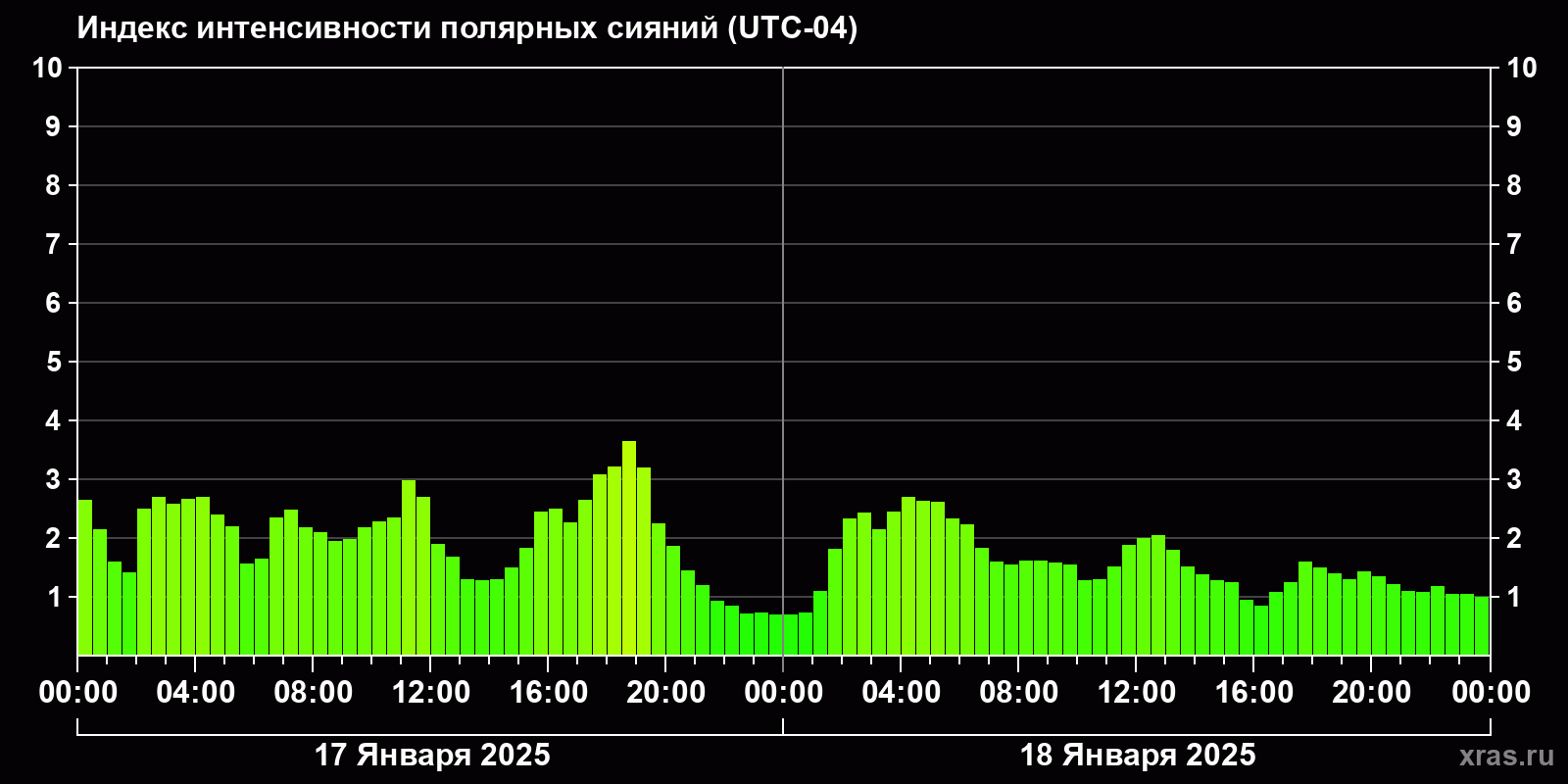 Изменения индекса интенсивности полярных сияний с 2025-01-17 по 2025-01-18 по местному времени