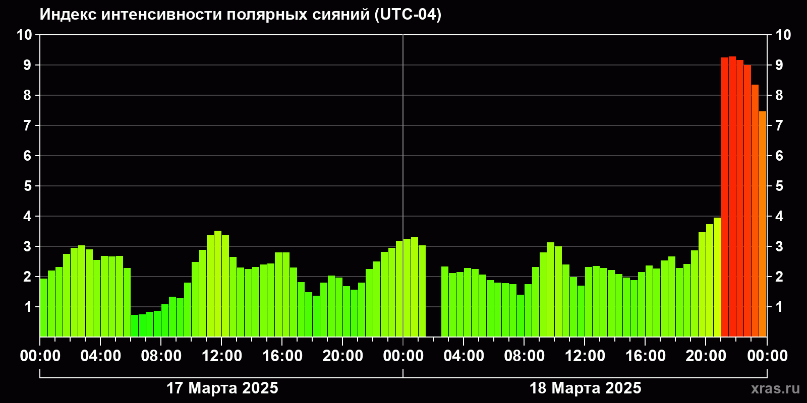 Изменения индекса интенсивности полярных сияний с 2025-03-17 по 2025-03-18 по местному времени