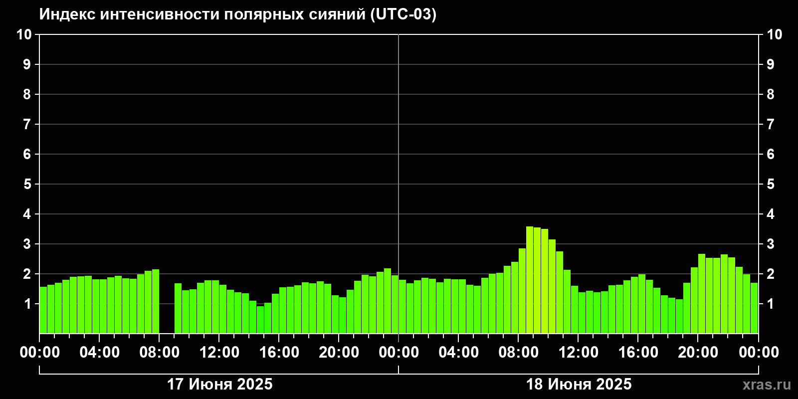 Изменения индекса интенсивности полярных сияний с 2025-06-17 по 2025-06-18 по местному времени