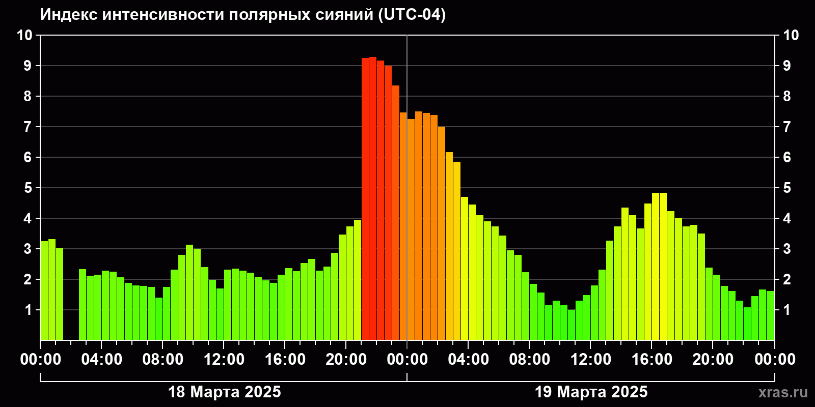 Изменения индекса интенсивности полярных сияний с 2025-03-18 по 2025-03-19 по местному времени