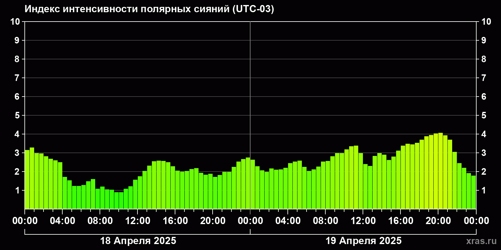 Изменения индекса интенсивности полярных сияний с 2025-04-18 по 2025-04-19 по местному времени