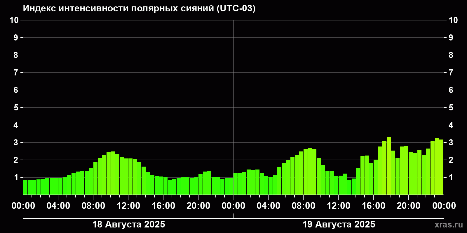 Изменения индекса интенсивности полярных сияний с 2025-08-18 по 2025-08-19 по местному времени