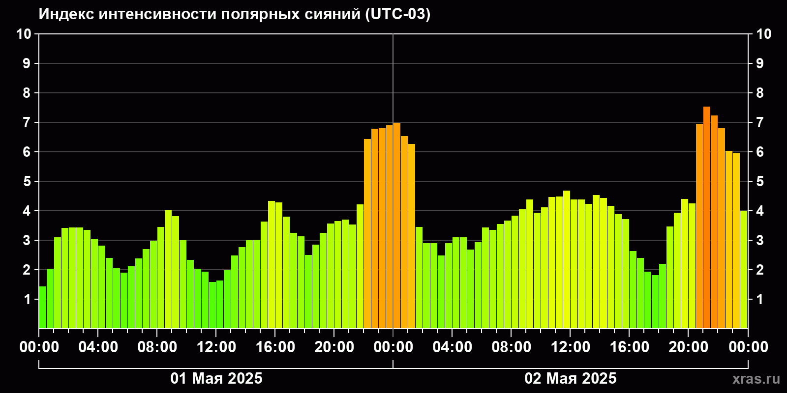 Изменения индекса интенсивности полярных сияний с 2025-05-01 по 2025-05-02 по местному времени