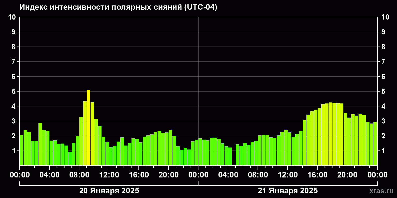 Изменения индекса интенсивности полярных сияний с 2025-01-20 по 2025-01-21 по местному времени