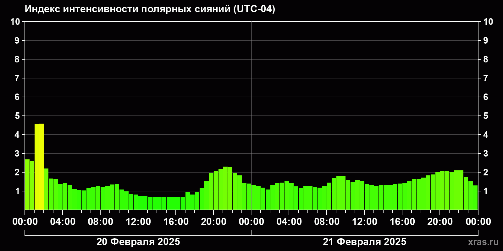 Изменения индекса интенсивности полярных сияний с 2025-02-20 по 2025-02-21 по местному времени