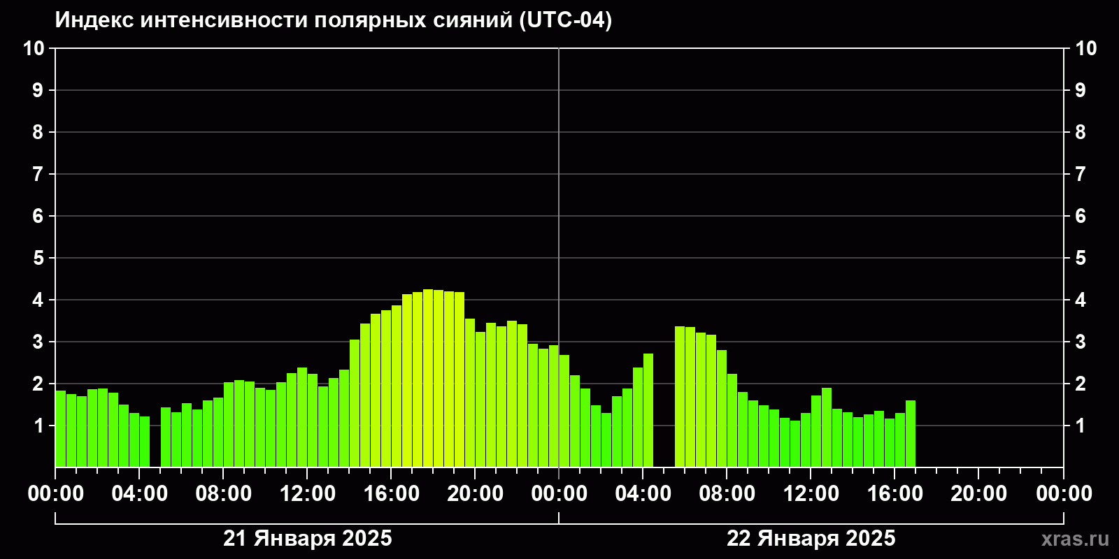 Изменения индекса интенсивности полярных сияний с 2025-01-21 по 2025-01-22 по местному времени