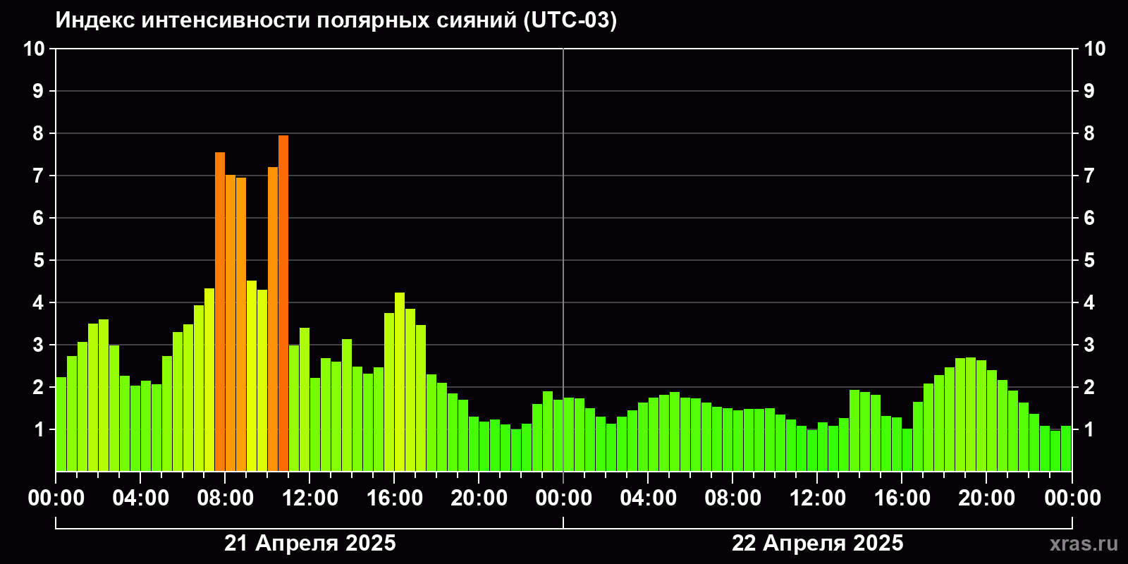 Изменения индекса интенсивности полярных сияний с 2025-04-21 по 2025-04-22 по местному времени
