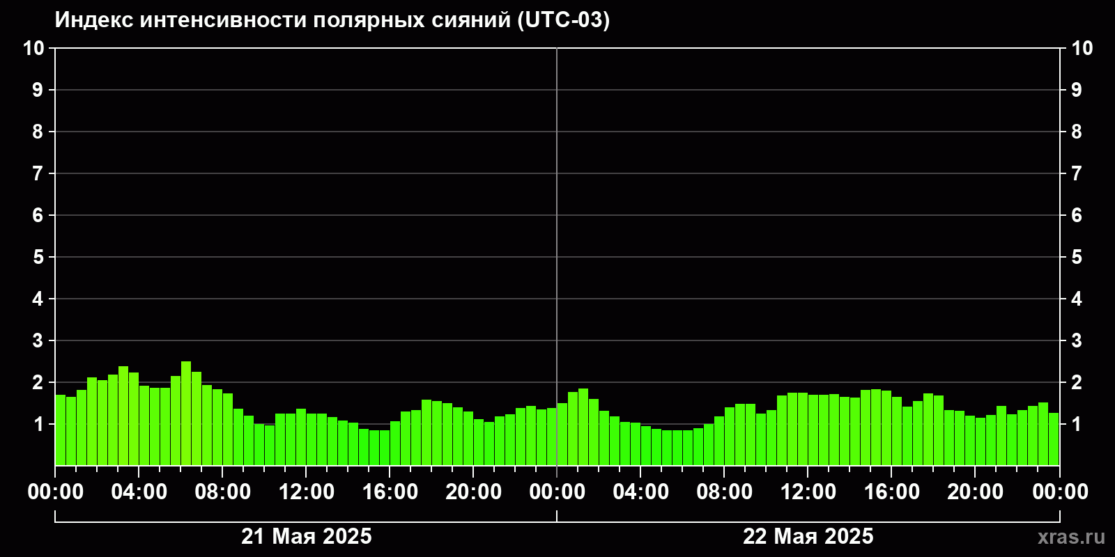 Изменения индекса интенсивности полярных сияний с 2025-05-21 по 2025-05-22 по местному времени