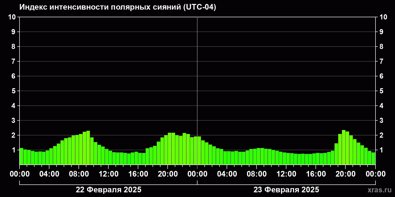 Изменения индекса интенсивности полярных сияний с 2025-02-22 по 2025-02-23 по местному времени