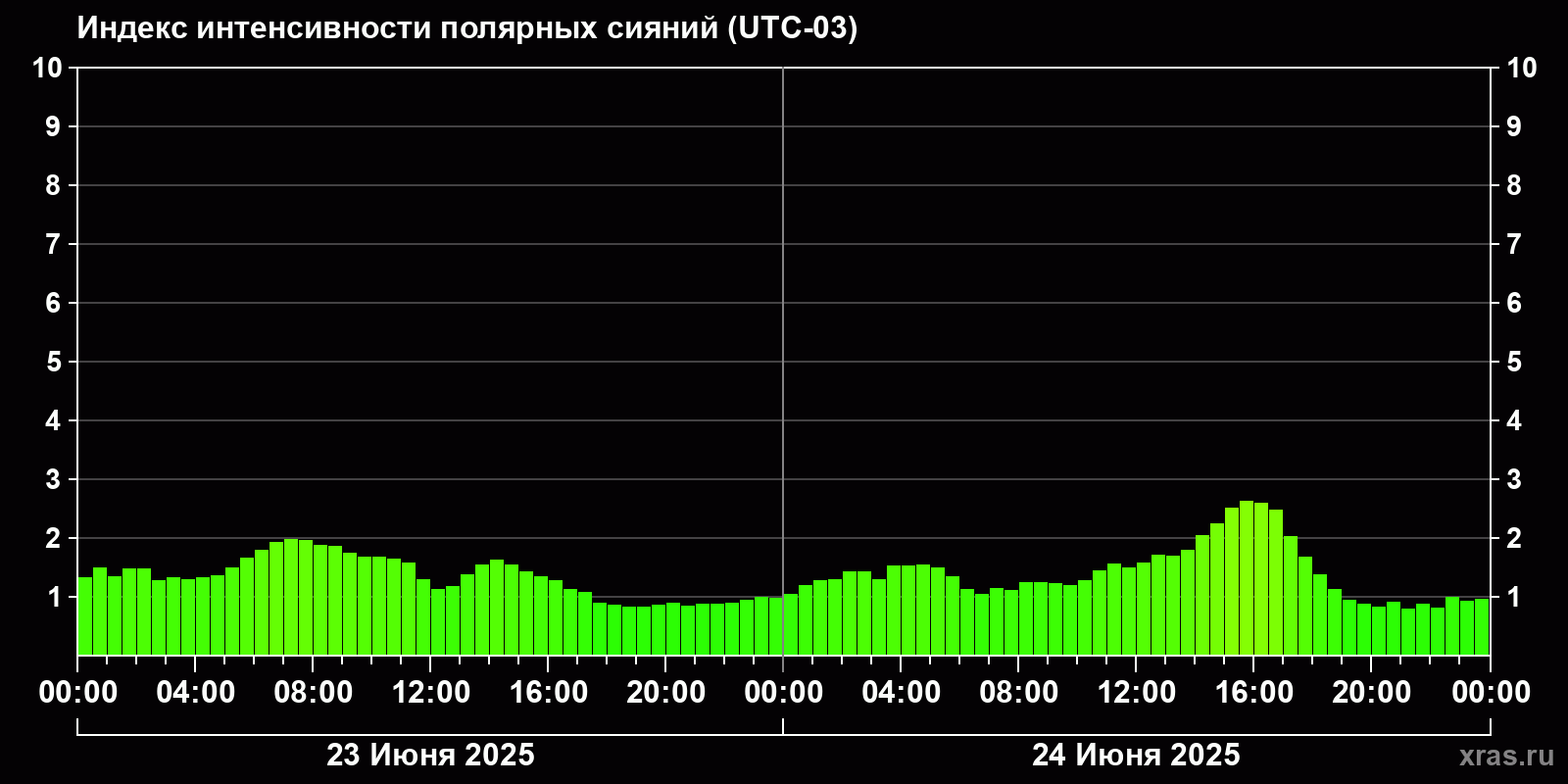 Изменения индекса интенсивности полярных сияний с 2025-06-23 по 2025-06-24 по местному времени