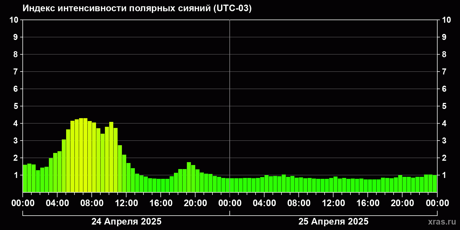 Изменения индекса интенсивности полярных сияний с 2025-04-24 по 2025-04-25 по местному времени