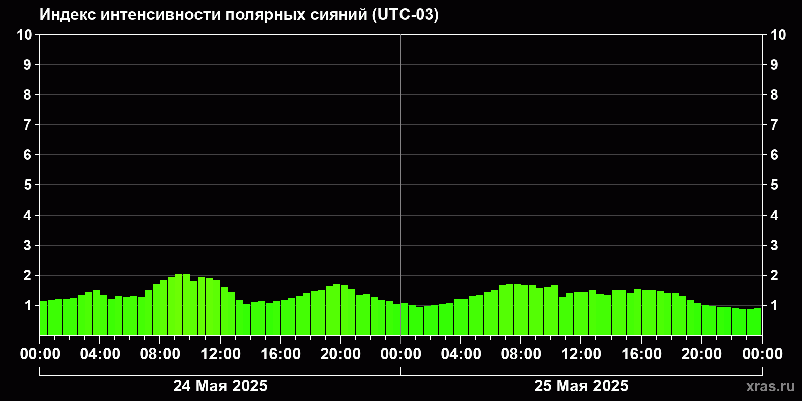 Изменения индекса интенсивности полярных сияний с 2025-05-24 по 2025-05-25 по местному времени