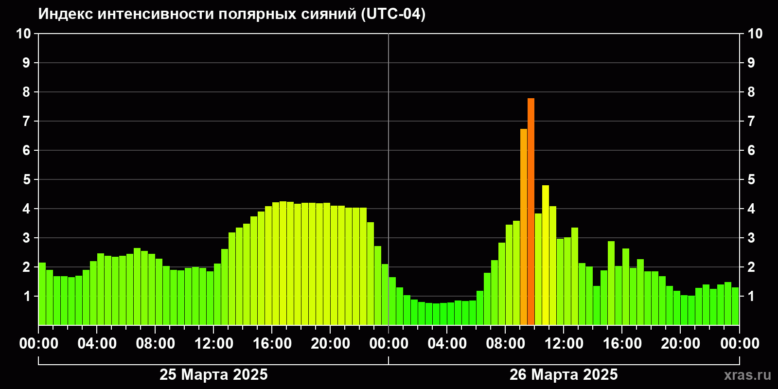 Изменения индекса интенсивности полярных сияний с 2025-03-25 по 2025-03-26 по местному времени