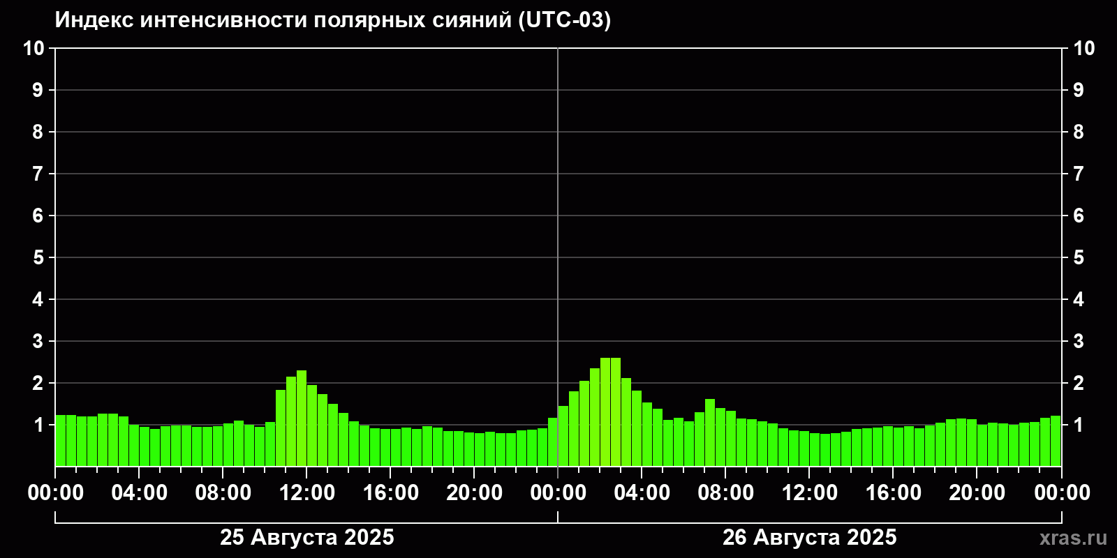 Изменения индекса интенсивности полярных сияний с 2025-08-25 по 2025-08-26 по местному времени