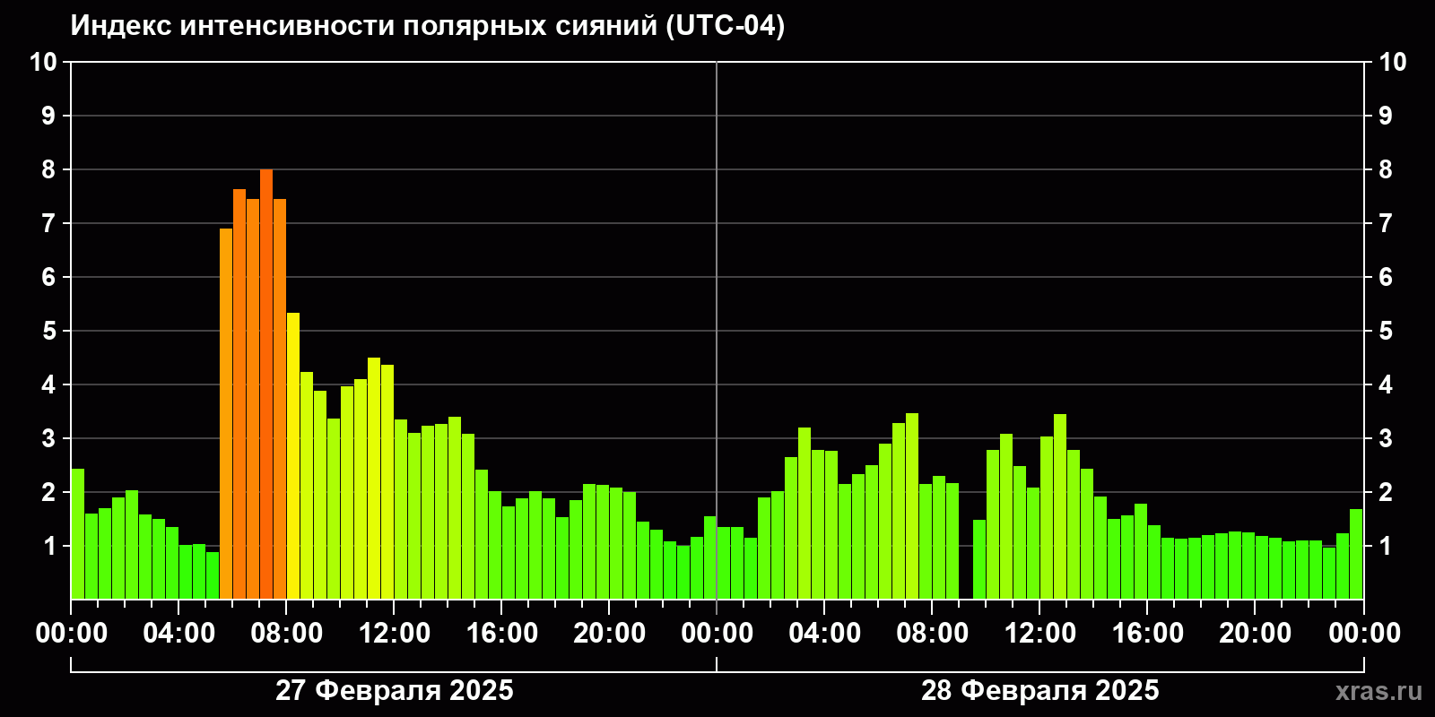 Изменения индекса интенсивности полярных сияний с 2025-02-27 по 2025-02-28 по местному времени