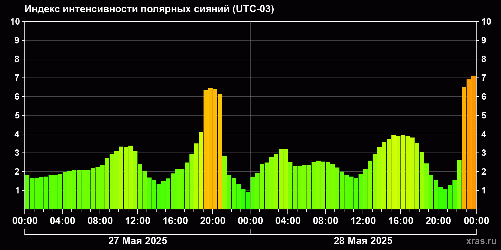 Изменения индекса интенсивности полярных сияний с 2025-05-27 по 2025-05-28 по местному времени