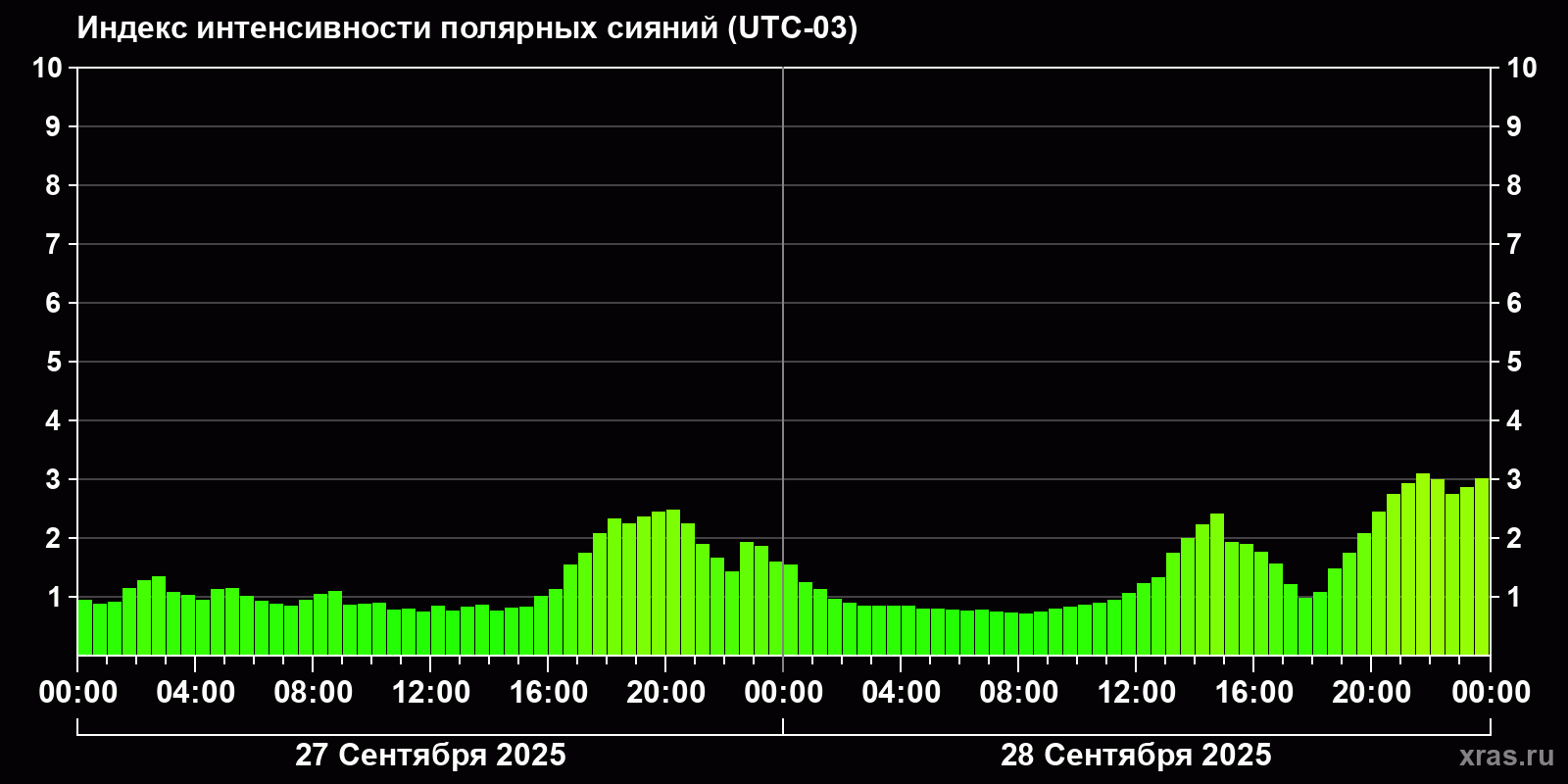 Изменения индекса интенсивности полярных сияний с 2025-09-27 по 2025-09-28 по местному времени
