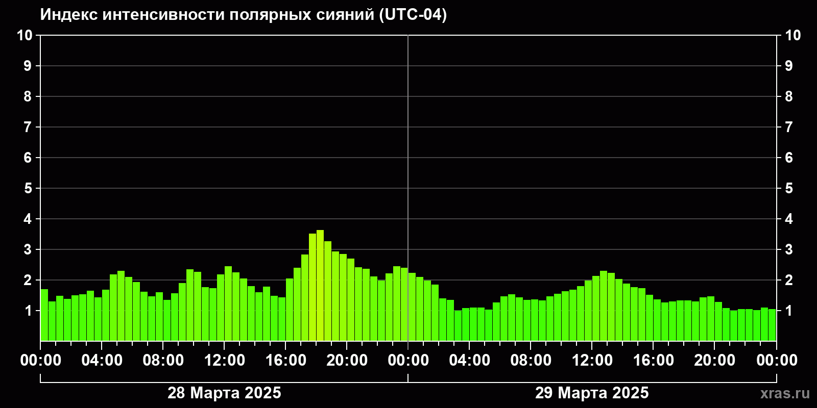 Изменения индекса интенсивности полярных сияний с 2025-03-28 по 2025-03-29 по местному времени