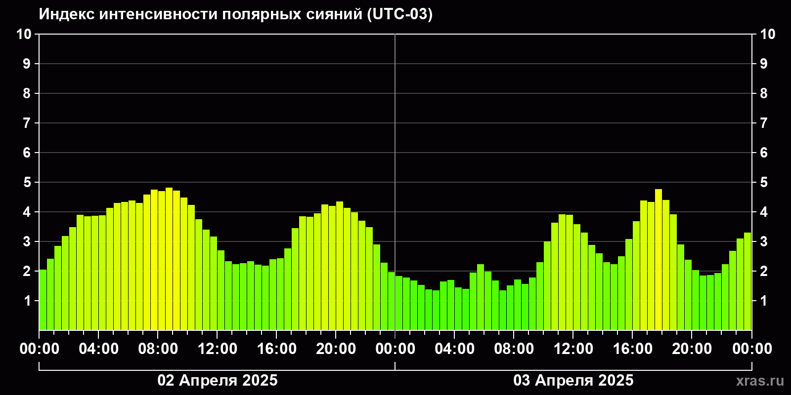 Изменения индекса интенсивности полярных сияний с 2025-04-02 по 2025-04-03 по местному времени