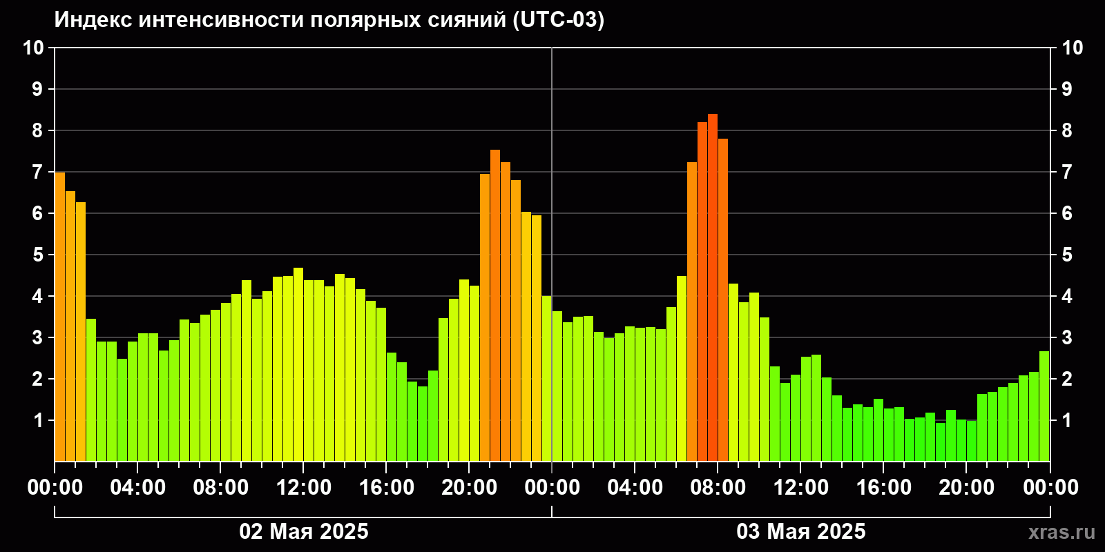 Изменения индекса интенсивности полярных сияний с 2025-05-02 по 2025-05-03 по местному времени