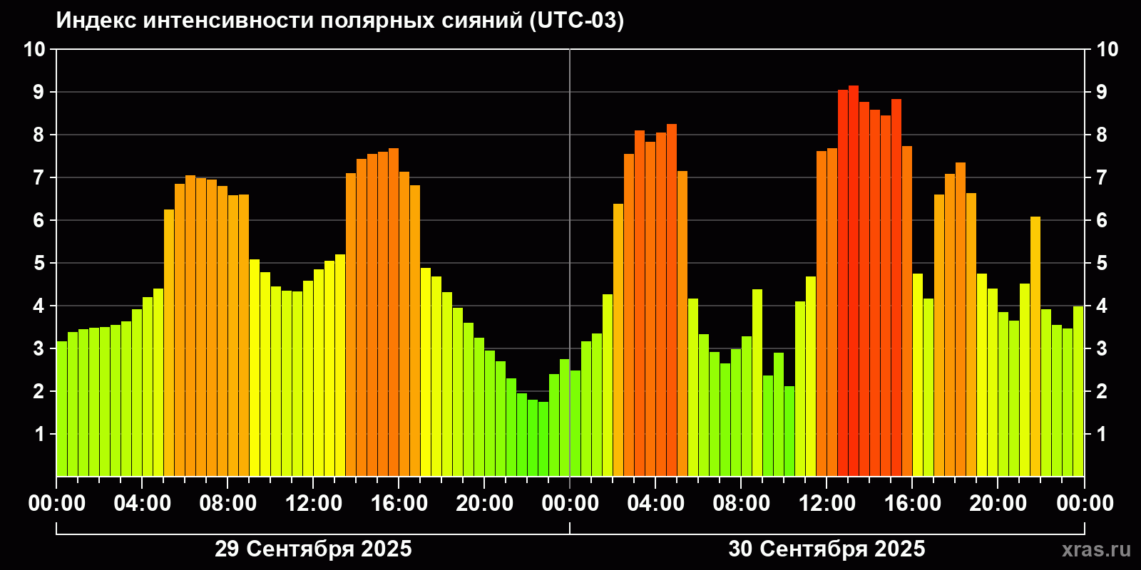 Изменения индекса интенсивности полярных сияний с 2025-09-29 по 2025-09-30 по местному времени