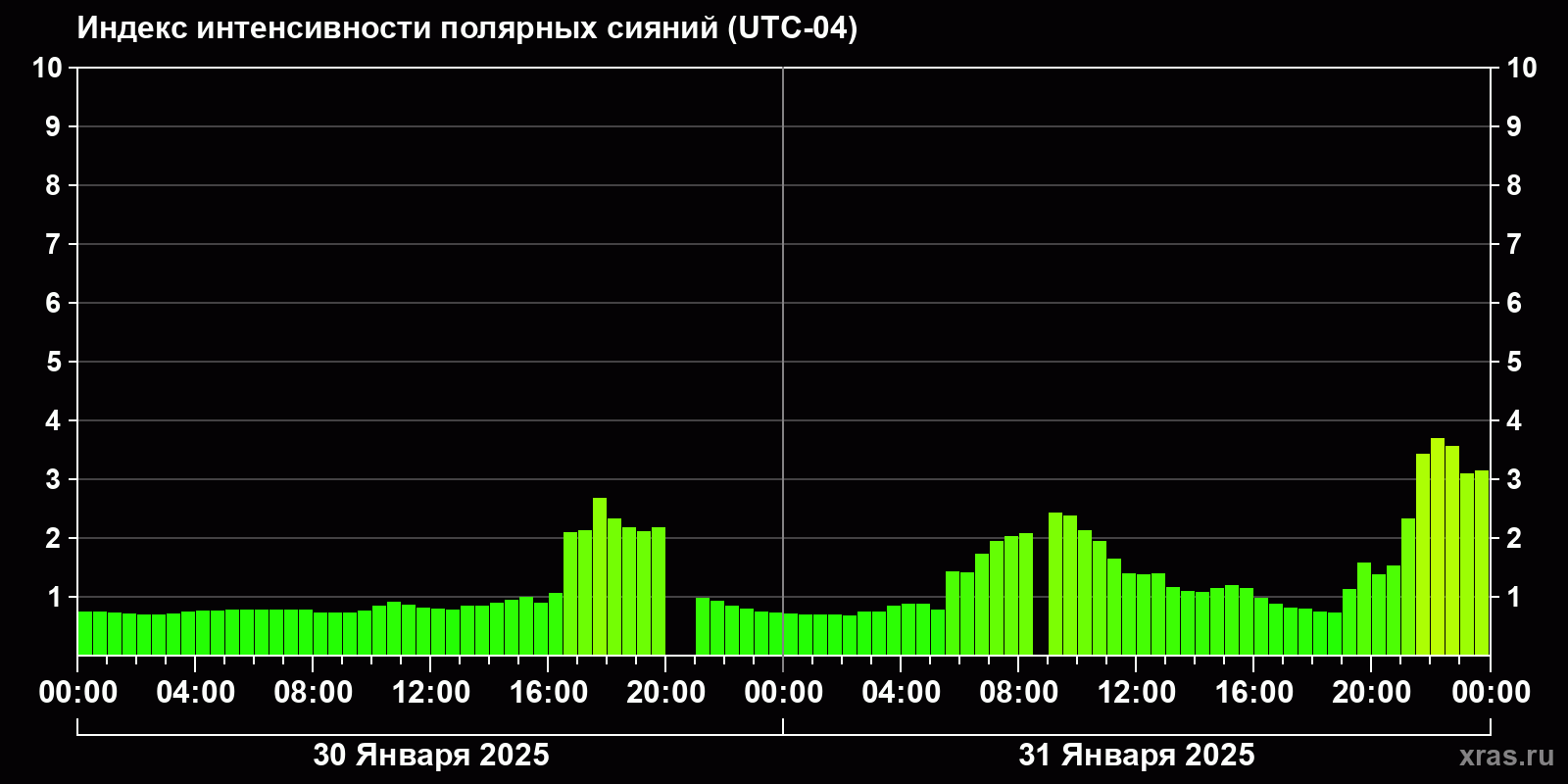 Изменения индекса интенсивности полярных сияний с 2025-01-30 по 2025-01-31 по местному времени